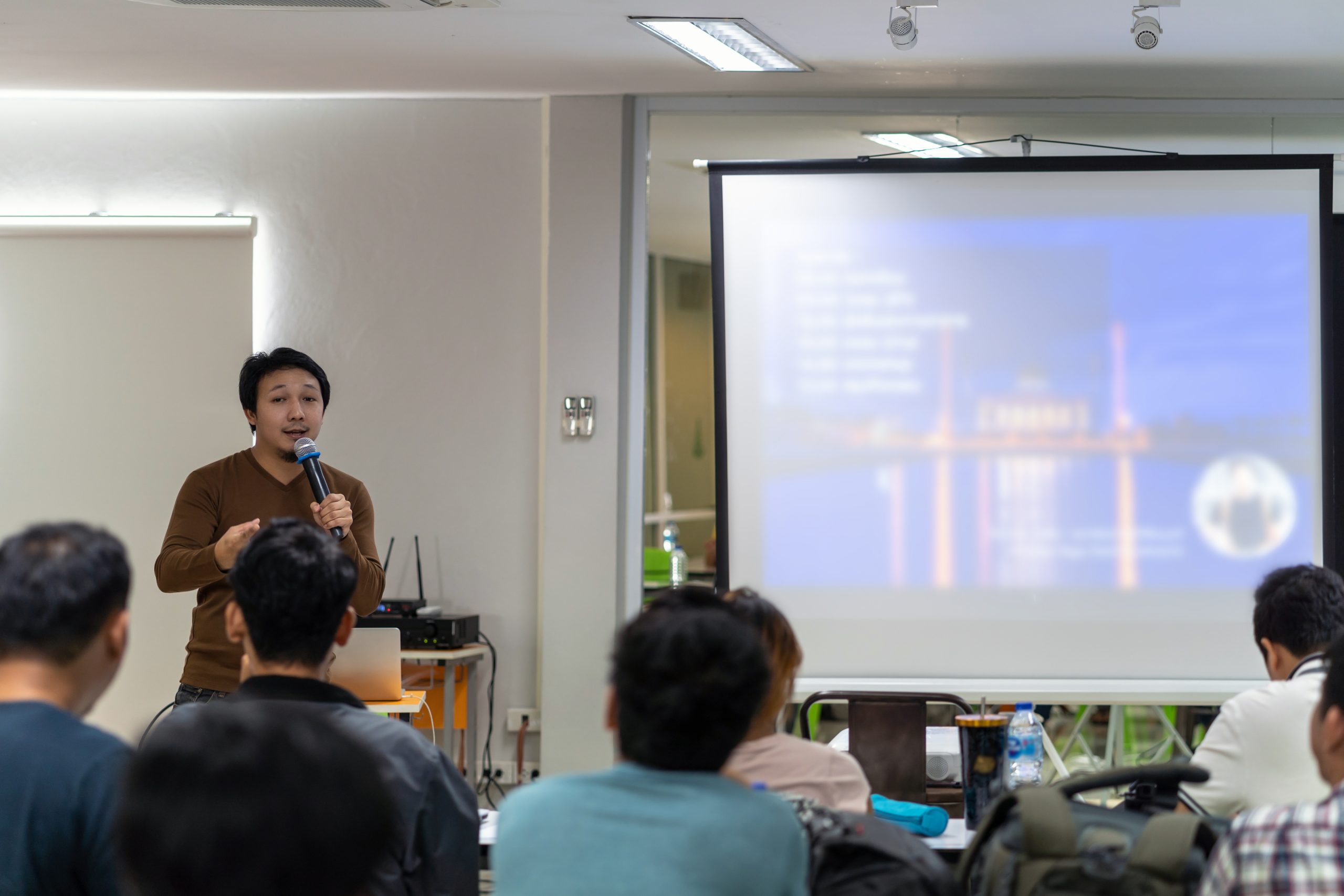 Asian Speaker or lecture with casual suit on the stage in front of the room presenting with the screen in the conference hall or seminar meeting room, business and education concept