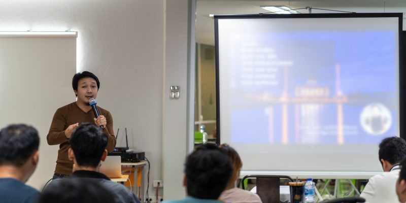 Asian Speaker or lecture with casual suit on the stage in front of the room presenting with the screen in the conference hall or seminar meeting room, business and education concept