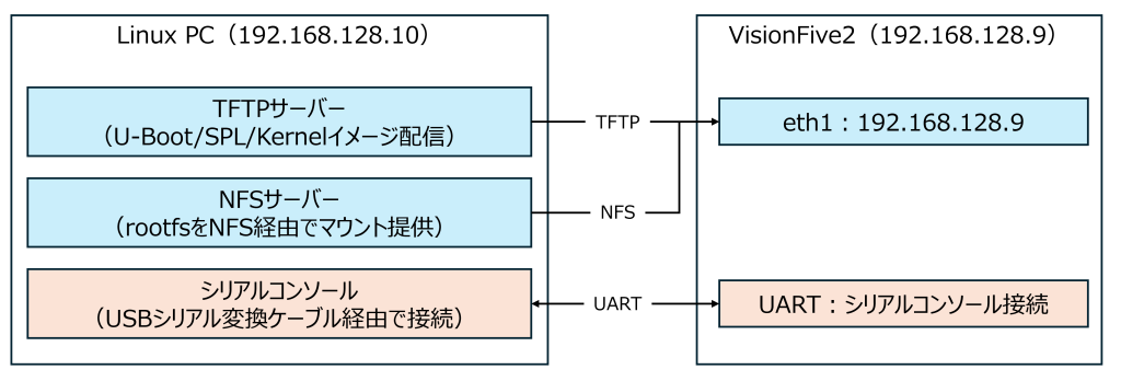 - Linux PC: TFTP/NFSサーバーとして動作し、VisionFive2にブートイメージとrootfsを提供します