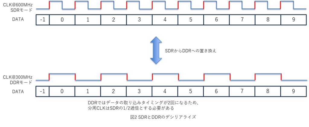 シリアライズする実効値は、データレートモードとシリアライズ係数を掛け合わせて決定されます。 SDRとDDRどちらに対応しているか、シリアライズ係数はいくつに設定可能となっているか、カタログスペックから比較して確認し、置き換え前後のシリアライズ実効値が一致するか確認が必要です。 データレートモードに違いがあっても、例えば1:10 SDRと1:5 DDRでは、シリアライズ実効値は同じになります。しかしSDRとDDRを置き換える場合、以下の図2で示すように、デシリアライズを行う分周クロックも逓倍させる必要があることに注意が必要です。