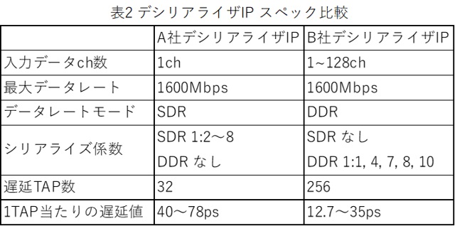デシリアライザIP置き換え検討において、カタログスペックとして比較する必要のある項目は以下表1となります。